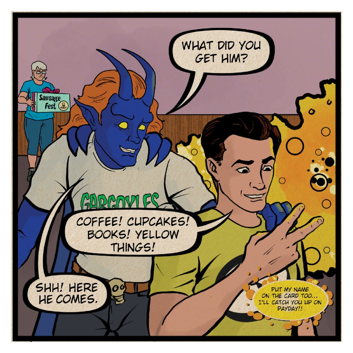PANEL THREE: RIV talks to SEAN, in the background, SHERRI has a big box labelled “Sausagefest” with a bow on top.