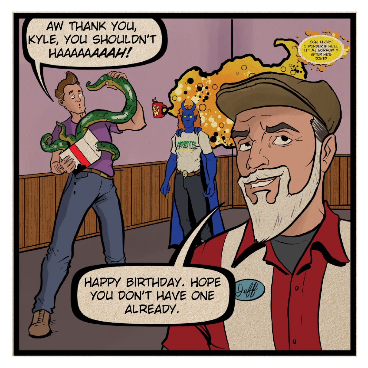 PANEL FOUR: KYLE presents a present to MICHAEL. Tentacles reach out from the box to ensnare him.